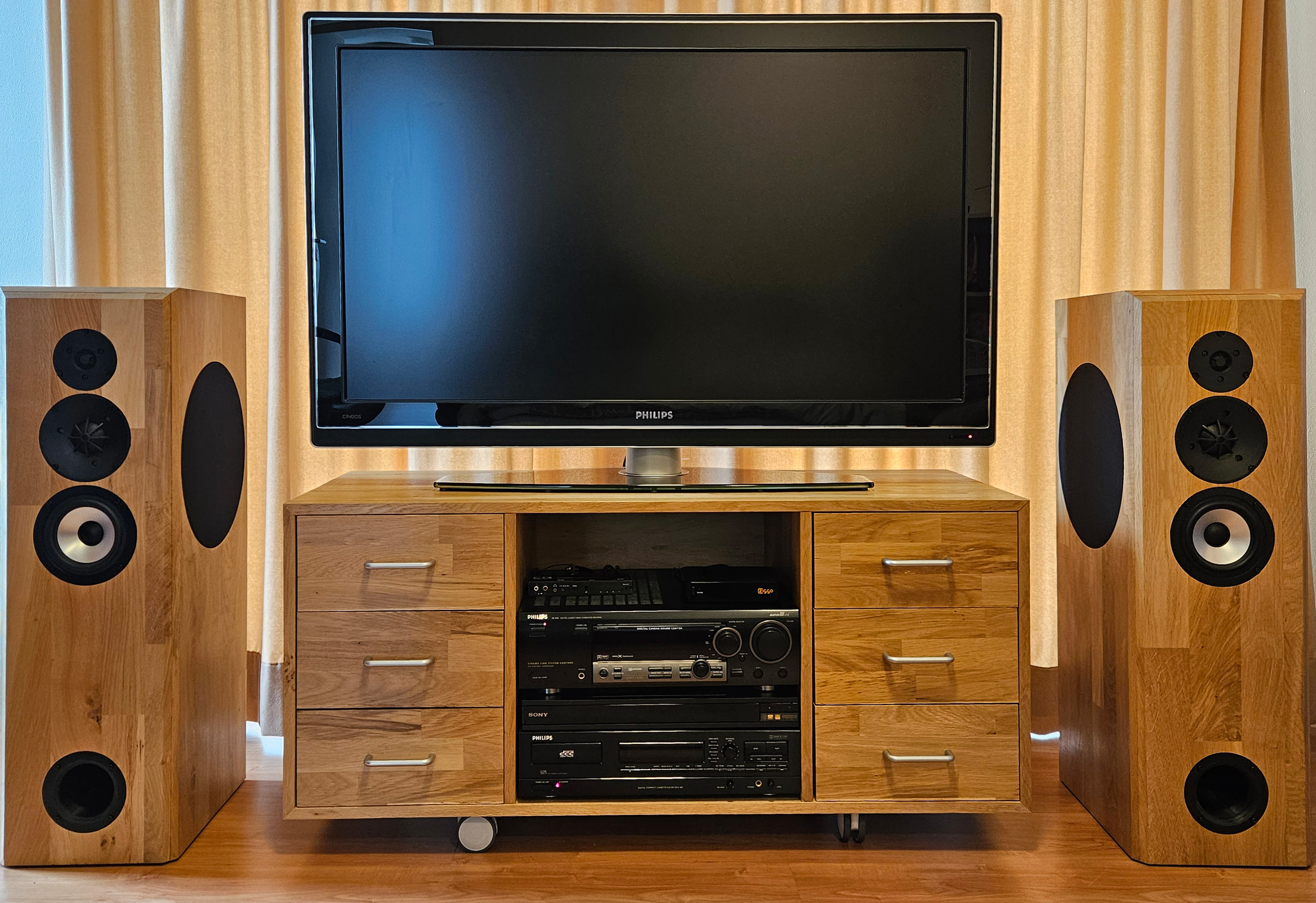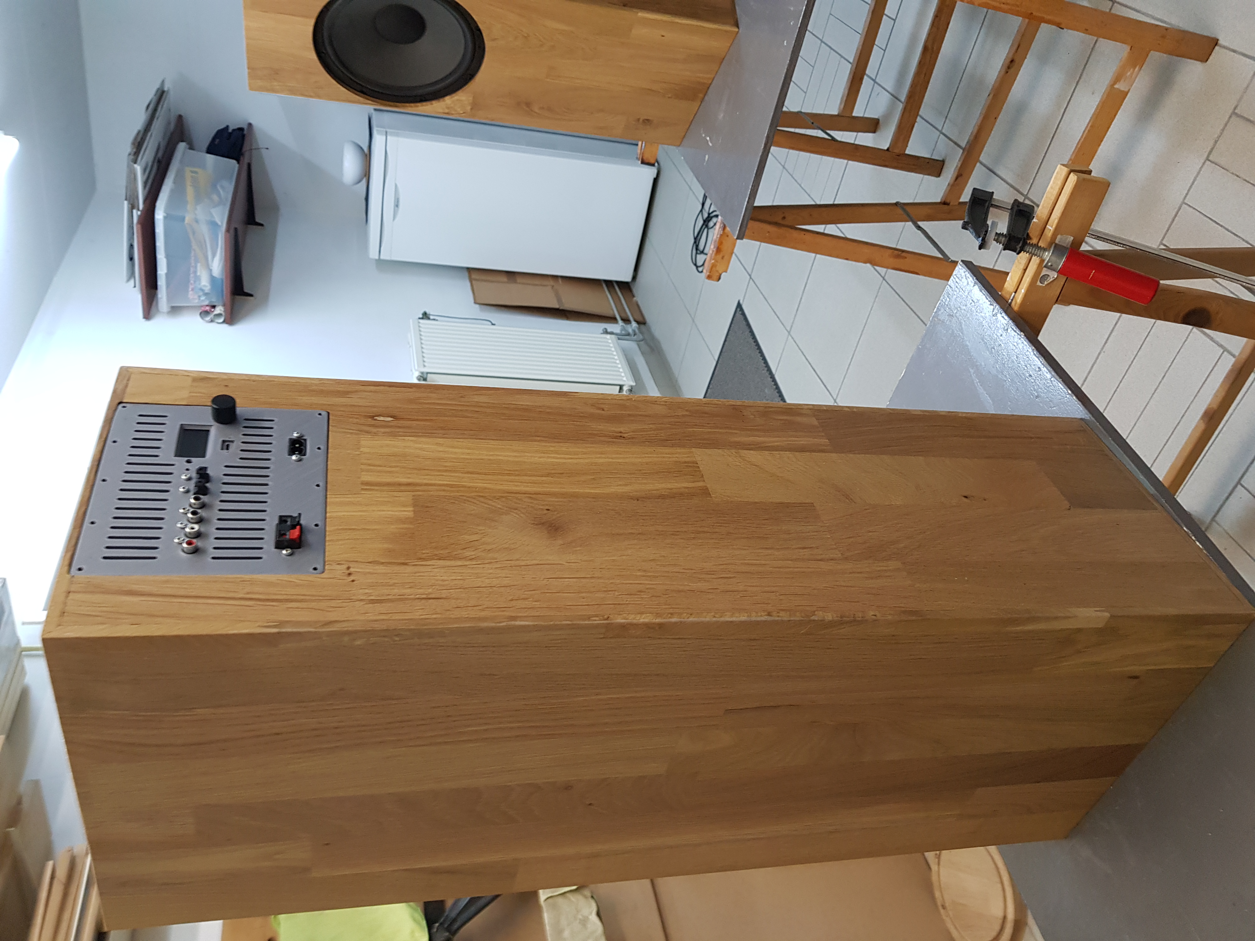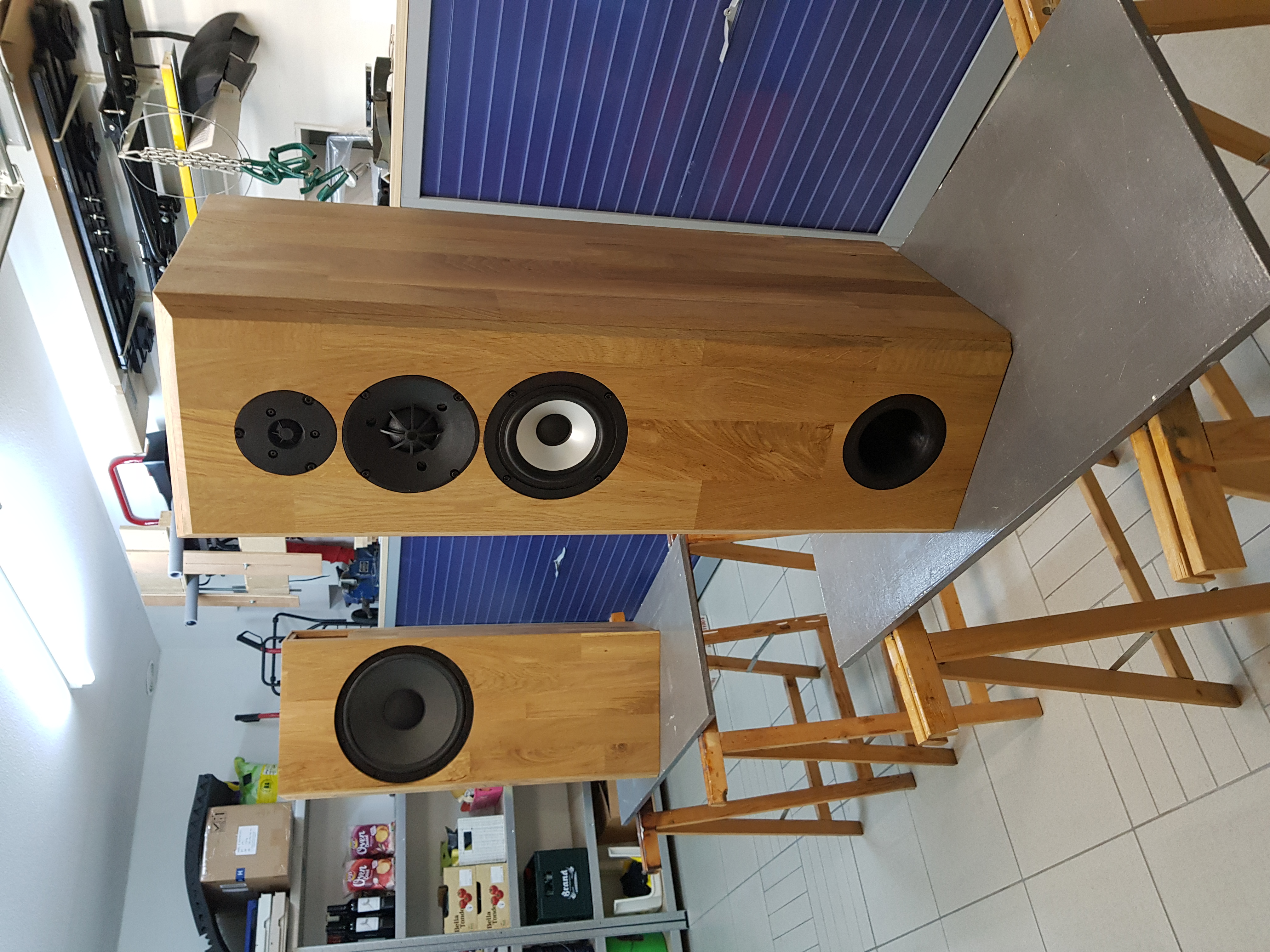 Voor de kasten heb ik massief eiken timmerpanelen (18 mm) gebruikt. Tussenschotjes dienen voor de stevigheid van de grotere oppervlakten. Alle elektronica is ondergebracht in een apart compartiment. Aan de voorzijde zijn op de hoeken afschuiningen aangebracht om invloed van de hoeken op het spectrum (baffle-step) te reduceren. Uit esthetisch oogpunt heb ik er voor gekozen om alle drivers op het hart van de voorzijde te zetten.