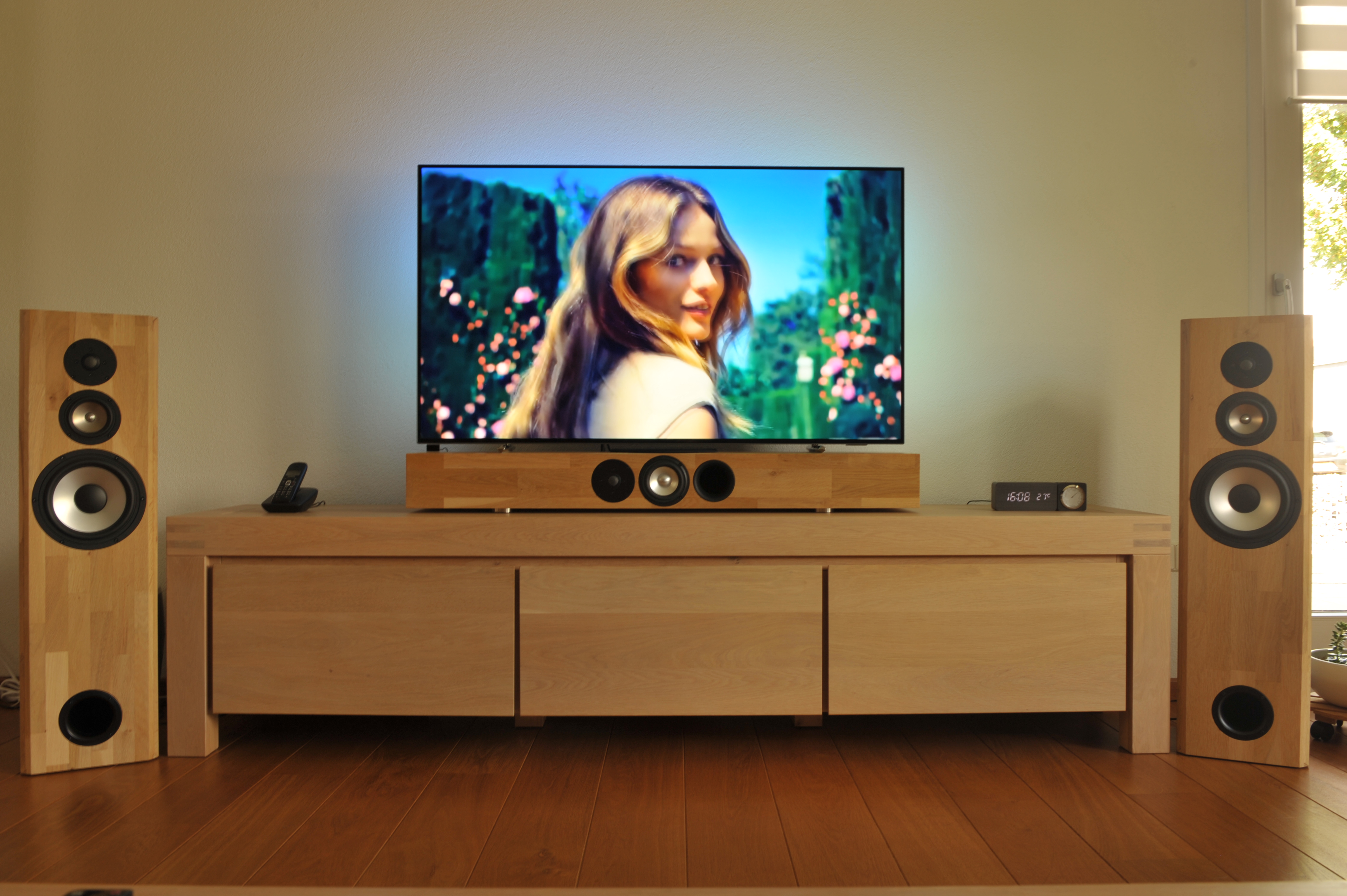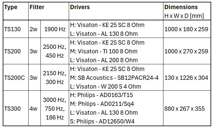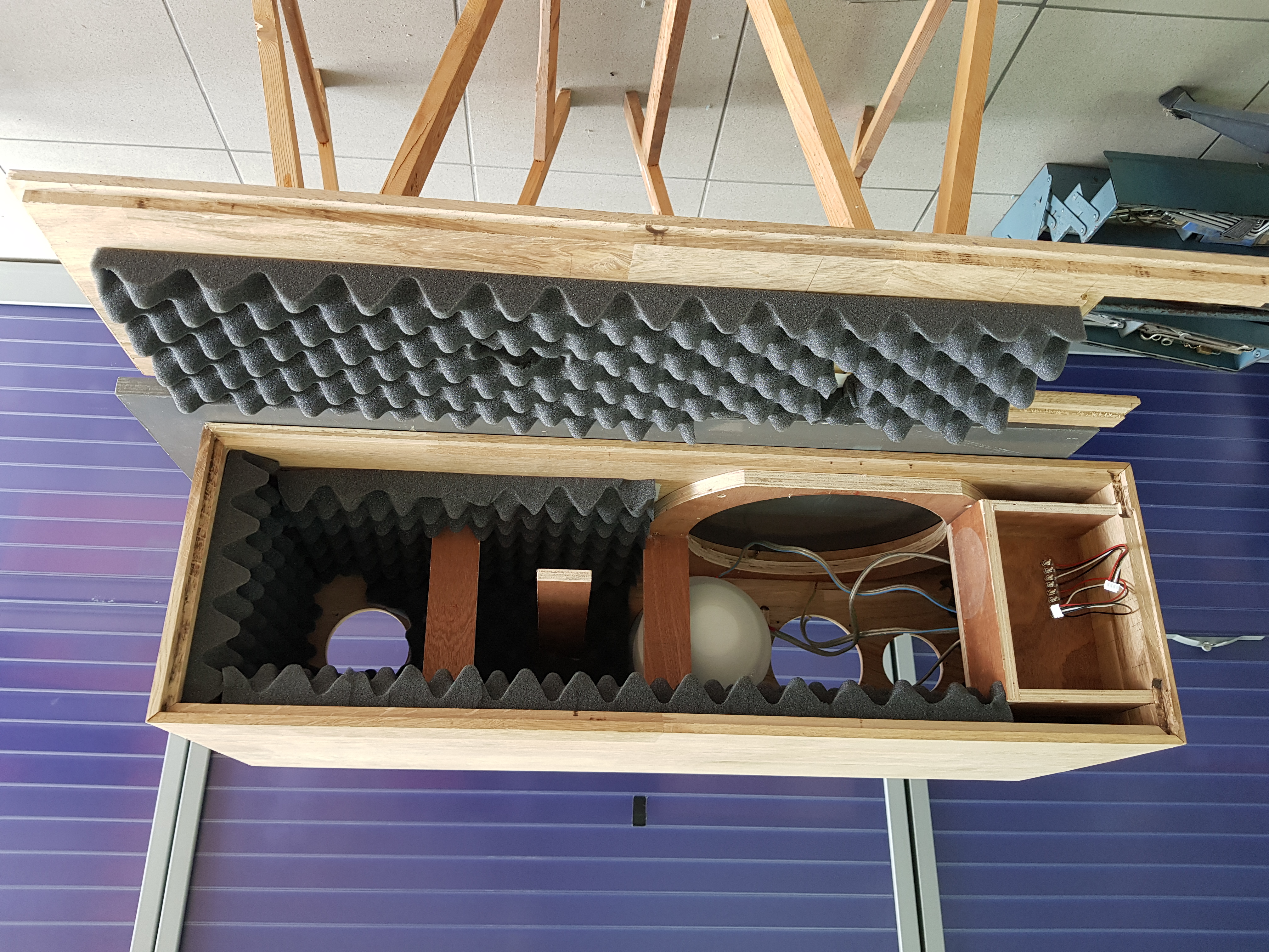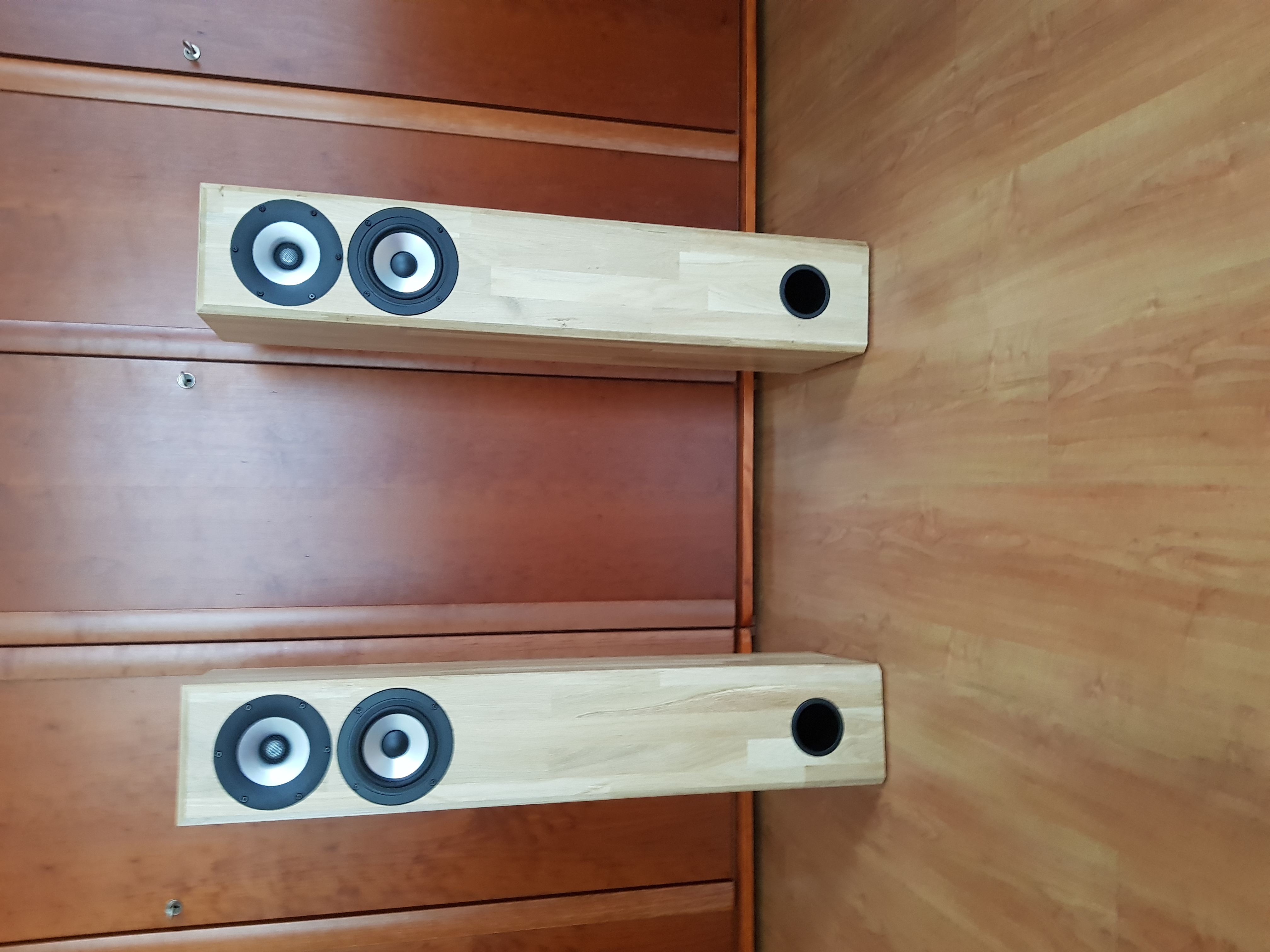Voor de kasten heb ik massief eiken timmerpanelen (18 mm) gebruikt. Tussenschotjes dienen voor de stevigheid van de grotere oppervlakten. Alle elektronica is ondergebracht in een apart compartiment. Aan de voorzijde zijn op de hoeken afschuiningen aangebracht om invloed van de hoeken op het spectrum (baffle-step) te reduceren. Uit esthetisch oogpunt heb ik er voor gekozen om alle drivers op het hart van de voorzijde te zetten.