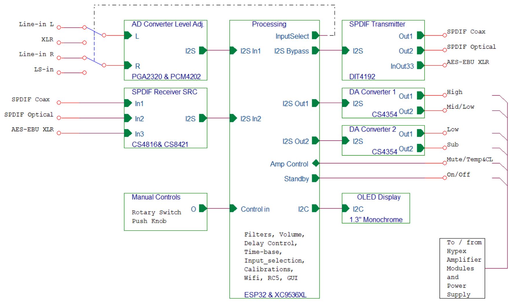 De architectuur van het ingangscircuit en de filters is als hieronder weergegeven. En daaronder schematisch het signaalpad in de software (TS200). Voor de eindversterkers en voeding maak ik gebruik van Hypex modules.